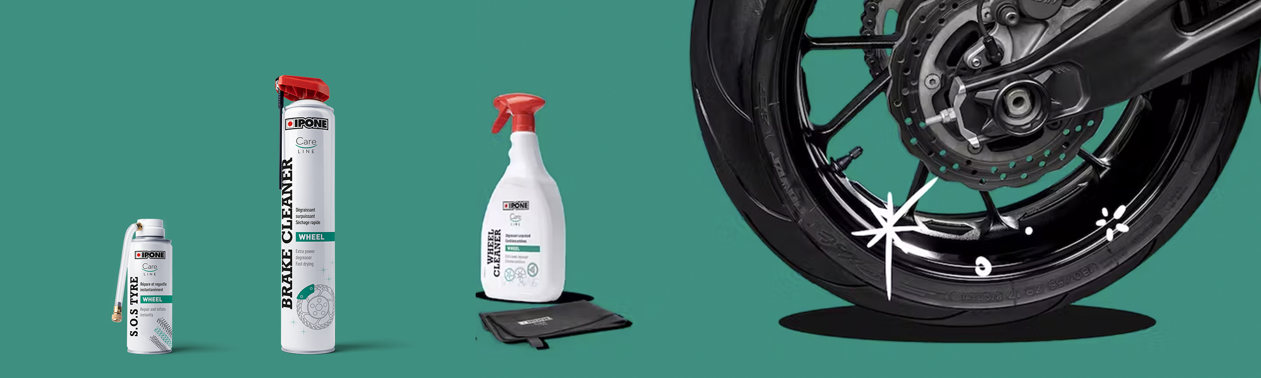 IPONE bietet die besten Pflegeprodukte, um die Felgen und Bremsen von Motorrädern und Rollern zu reinigen und zu pflegen. Der Bremsenentfetter reinigt das gesamte Bremssystem (Dichtungen, Scheiben, Beläge, Bremssättel) und die Kupplung. Der Felgenreiniger reinigt und entfettet alle Arten von Felgen (Alufelgen, lackierte, verchromte, lackierte). IPONE begleitet Sie auch bei Reifenproblemen mit dem Pannenspray.