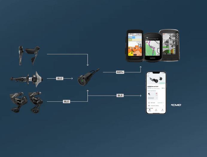 Das TRP CMD- oder „Command“-System nutzt ein drahtloses Protokoll für die nahtlose Kommunikation zwischen Komponenten wie Schalthebeln, Umwerfern und Zubehör. Diese Technologie macht herkömmliche Kabel und Gehäuse überflüssig und verbessert sowohl die optische Klarheit als auch die aerodynamische Effizienz des Fahrrads.