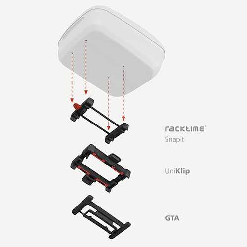 Les accessoires équipés du système GTA peuvent être encliquetés dans le support supérieur de la plaque d'adaptation du rack et verrouillés par le cadenas central. Grâce à la configuration identique des trous dans le fond du sac, les accessoires avec les adaptateurs UniKlip, Racktime, Snapit, MIK peuvent être facilement convertis au système GTA.