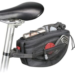 Une sacoche compact et extensible avec une fixation robuste renforcée en fibres de verre. Particulièrement adaptée à l’utilisation sur un VTT grâce à sa forme compacte, elle est munie d'un compartiment principal volumineux, de poches filet de chaque côté et d'un élastique sur le dessus. Comprend une poignée pour le transport, un support à lumière et un réflecteur.
