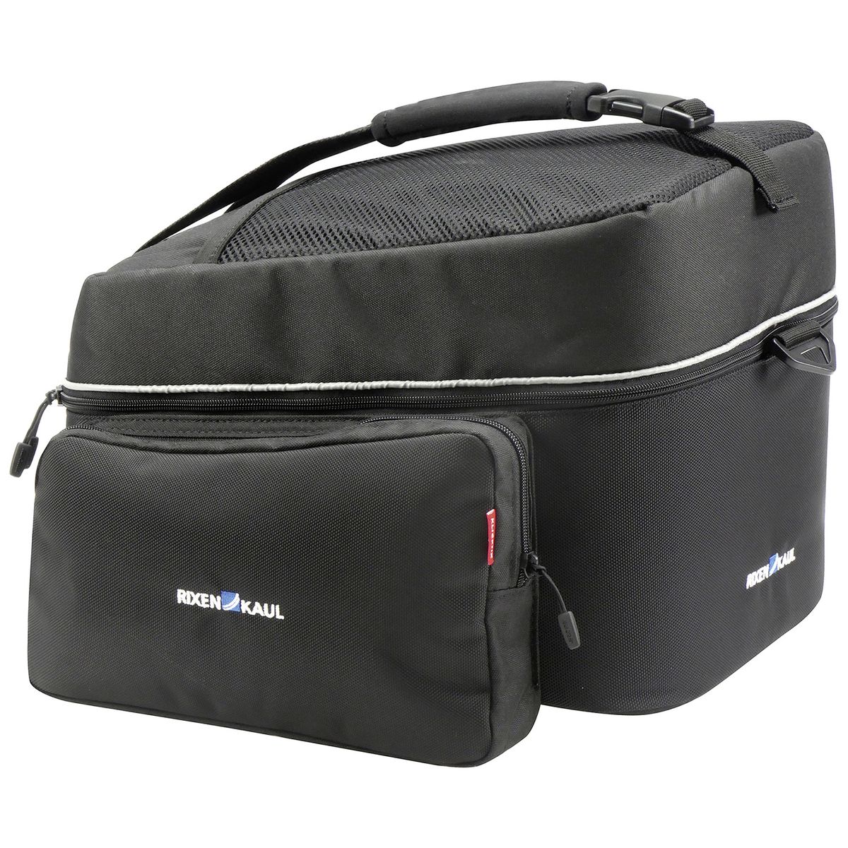 Extra geräumige Rackpack mit großem Hauptfach. Das Tourengepäck lässt sich im Haupt- und Innenfach und zwei großzügigen Seitentaschen übersichtlich und gut zugänglich verstauen. Der geöffnete Taschendeckel kann separat bepackt und der Inhalt durch ein Netz mit Reißverschluss gesichert werden. In einem Netzfach auf der Oberseite des Deckels lässt sich beispielsweise nasse Kleidung unterbringen. Zur Touring Ausstattung zählen außerdem der umlaufende Reflektor, ein komfortabler Schultergurt, die Regenhaube und der verstellbare Tragegriff.